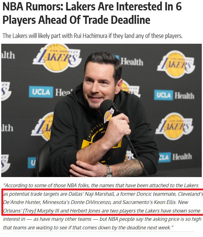 随着交易截止日的临近,美媒《FW》曝光湖人6大补强人选,分别是独行侠的马绍尔、森林狼的迪温琴佐、骑士的亨特、国王的埃斯利和鹈鹕的赫伯特·琼斯、墨菲。